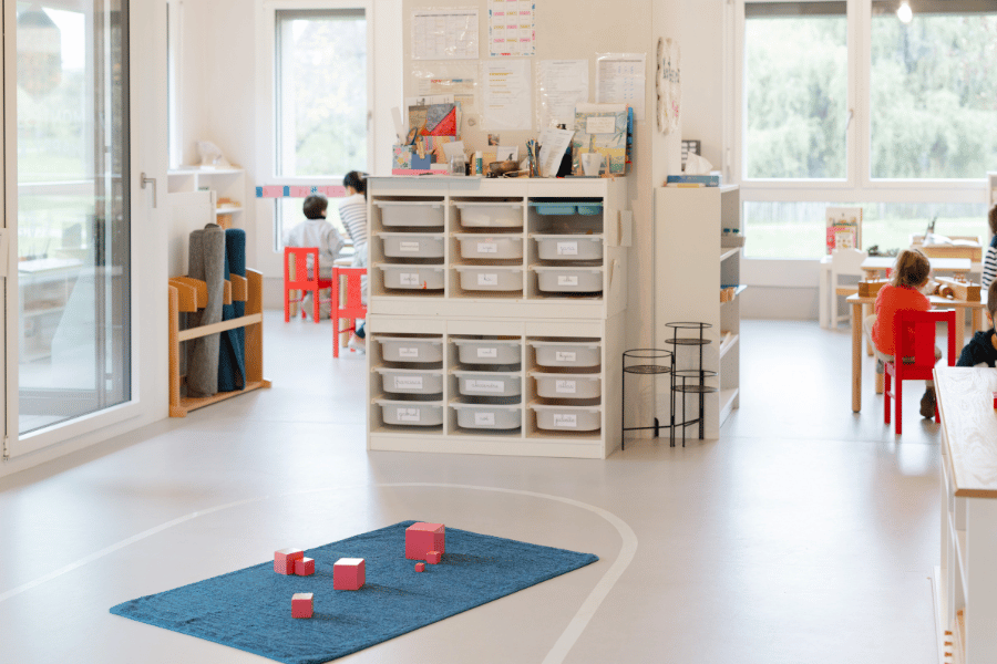 Child learning to read with reading cards in a Montessori classroom in Lancy, Geneva