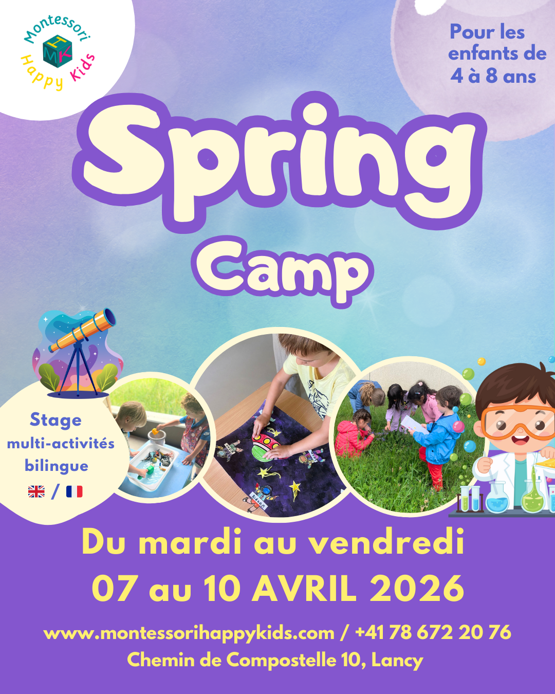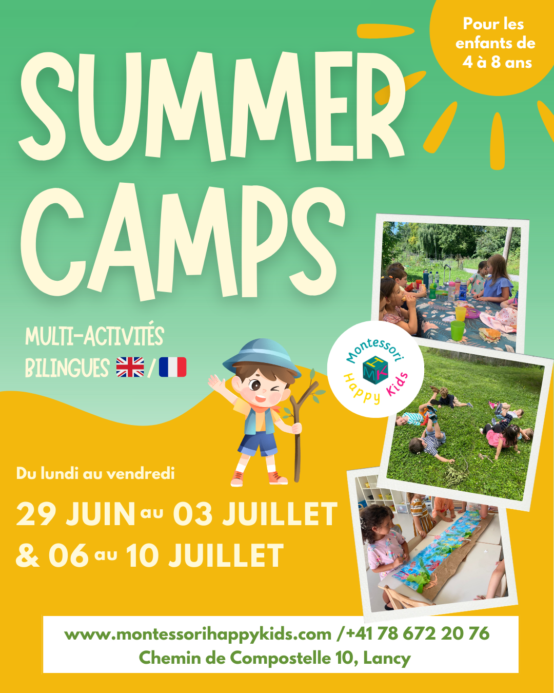In a bilingual English and French environment, Montessori Happy Kids Camps welcomes children aged 4 to 8 from all schools during the school holidays: October, February, April, and two weeks in July. Each holiday camp has a specific theme. The program is rich and captivating, with fun, varied, and educational activities for children.